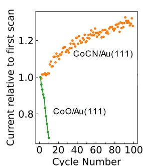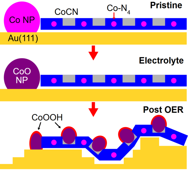 Through X-ray spectroscopy, the team analyzed the atomic-level interactions between cobalt and the surrounding carbon nitride matrix during the OER. The researchers could show that oxidized cobalt nanoparticles on the surface of the catalyst are reorganizing themselves as CoOOH and anchoring in the pockets of carbon nitride framework (Figure 1).