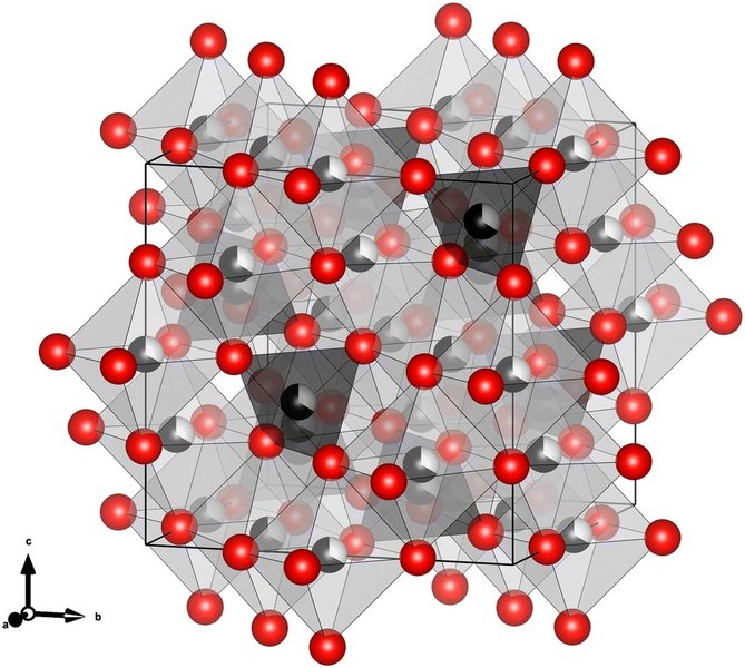 - Tetrahedral (A) sites, surrounded by four oxygen atoms (shown in the figure as dark gray shaded areas)